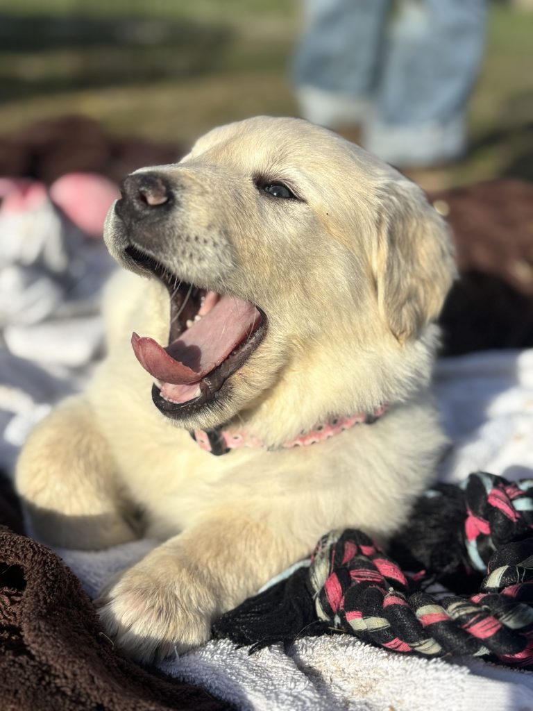 I’m a total people puppy. I love being held, cuddled, and doted on, and I’m happiest when I’m snuggled up with my humans or having a good snooze. I’ve got a very sweet, gentle nature and spend a lot of my time napping and recharging in between short bursts of puppy play.