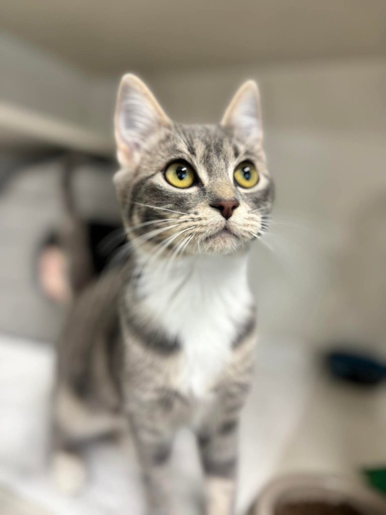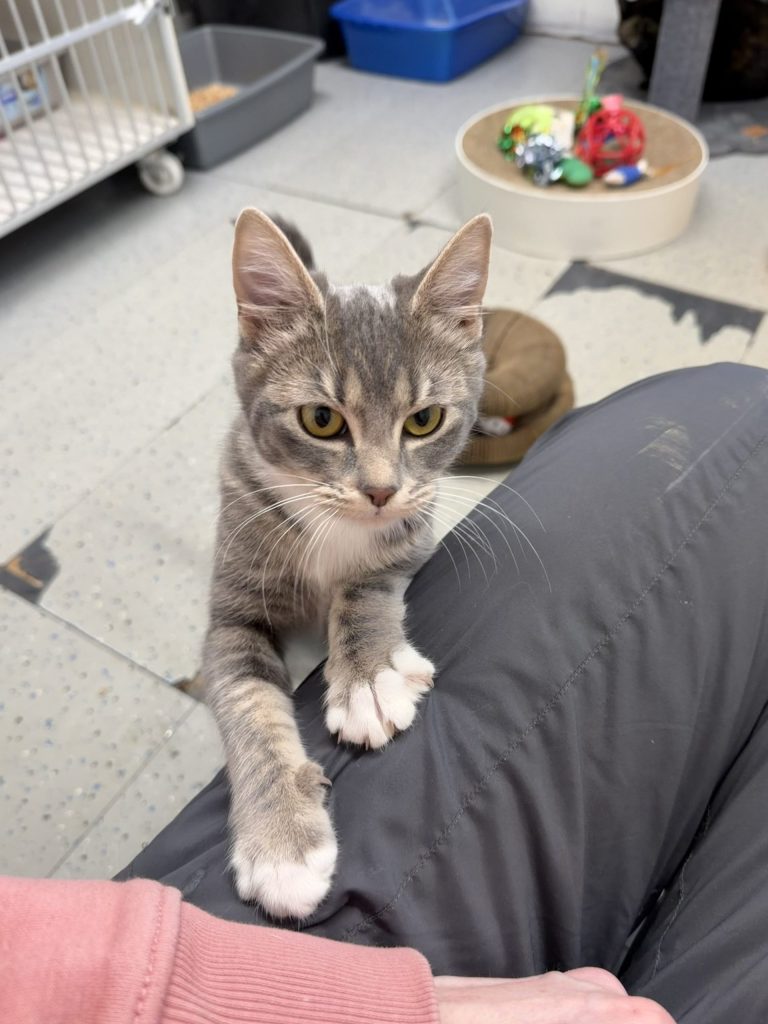 The first to seek out the humans for attention and pets, Shasta is equal parts playful and loving. Looking for a home where she will be doted on, adored and worshipped for the beauty she is, Shasta would love nothing more than to curl up in your lap and purr all your troubles away. An inquisitive kitten, she’s enjoying learning all about affection, play and safety. Jingleballs and wand toys don’t stand a chance as she pounces with conviction…much like how she plans to land herself in your heart!